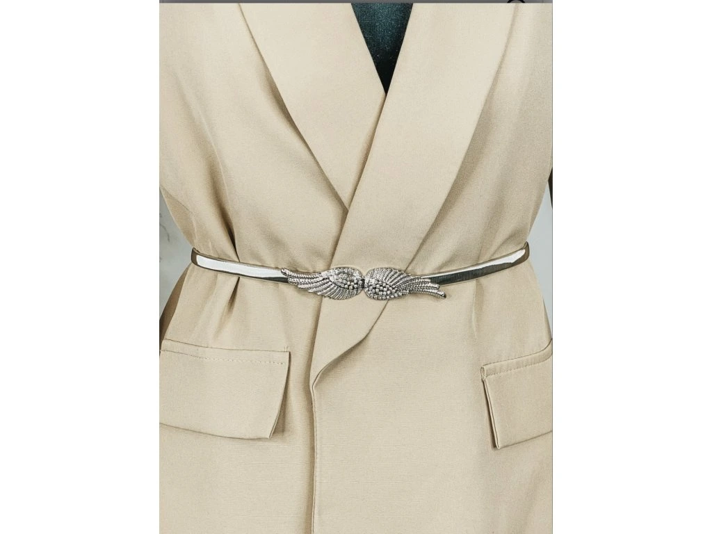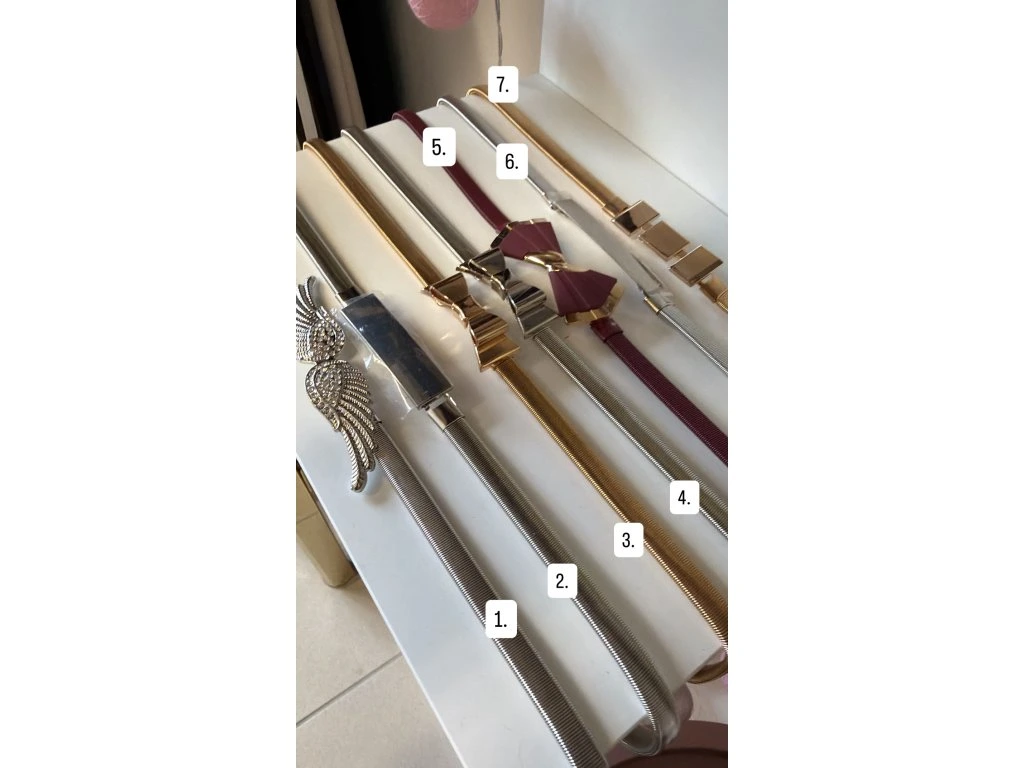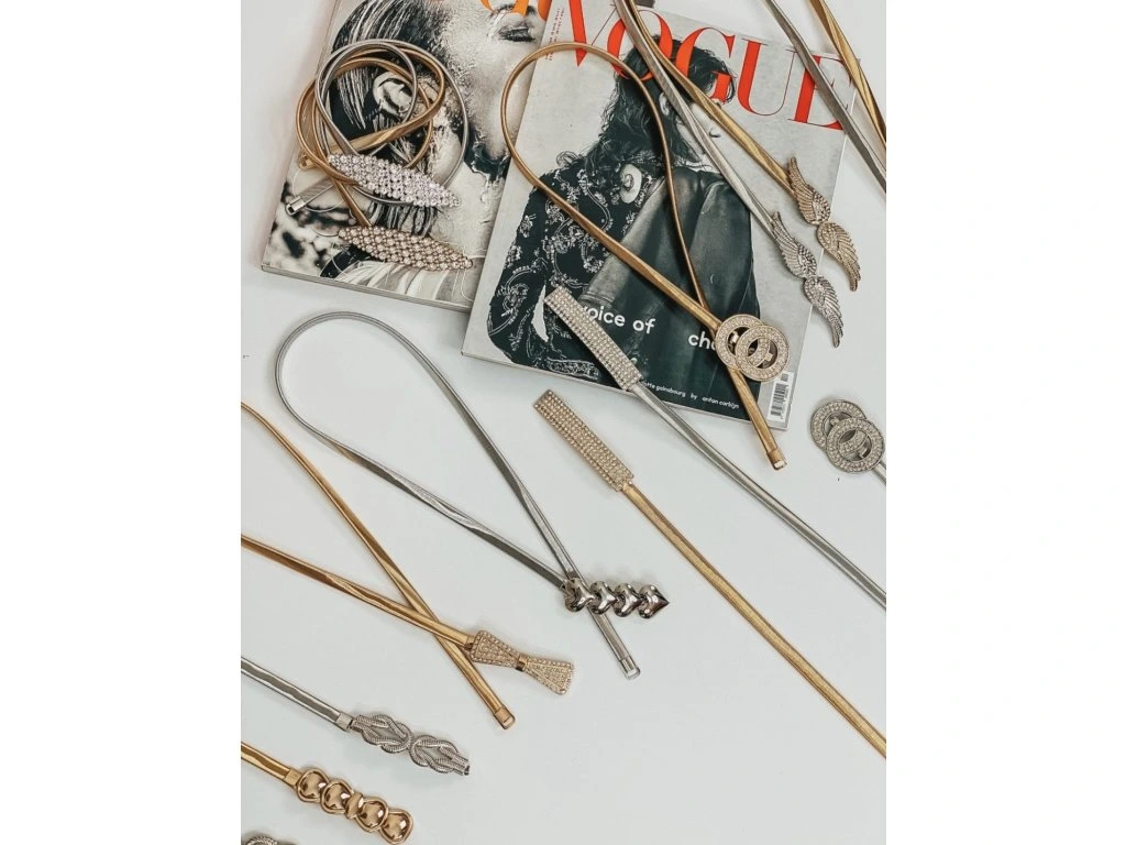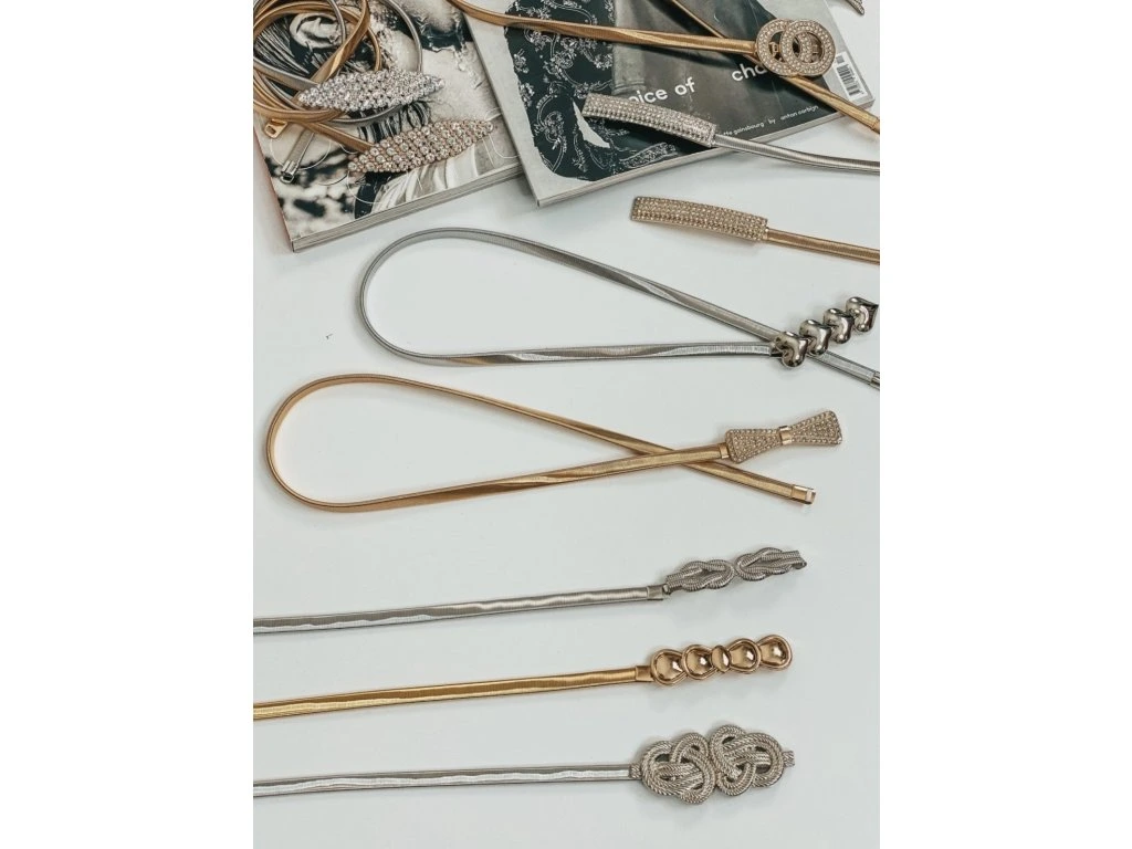 Dámský pásek s kovovou ozdobou, který tě překvapí svou pružnostíí. Je vyrobený z ploché kovové pružiny, která se skvěle přizpůsobí tvému pasu. Zapíná se ve středu pomocí očka na háčku.